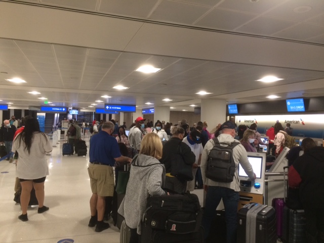 The people for the flight to Miami leaving from Gate 29 line up. The line extends past gate 27 and down the concourse. I wonder about social distancing. They get on their plane.