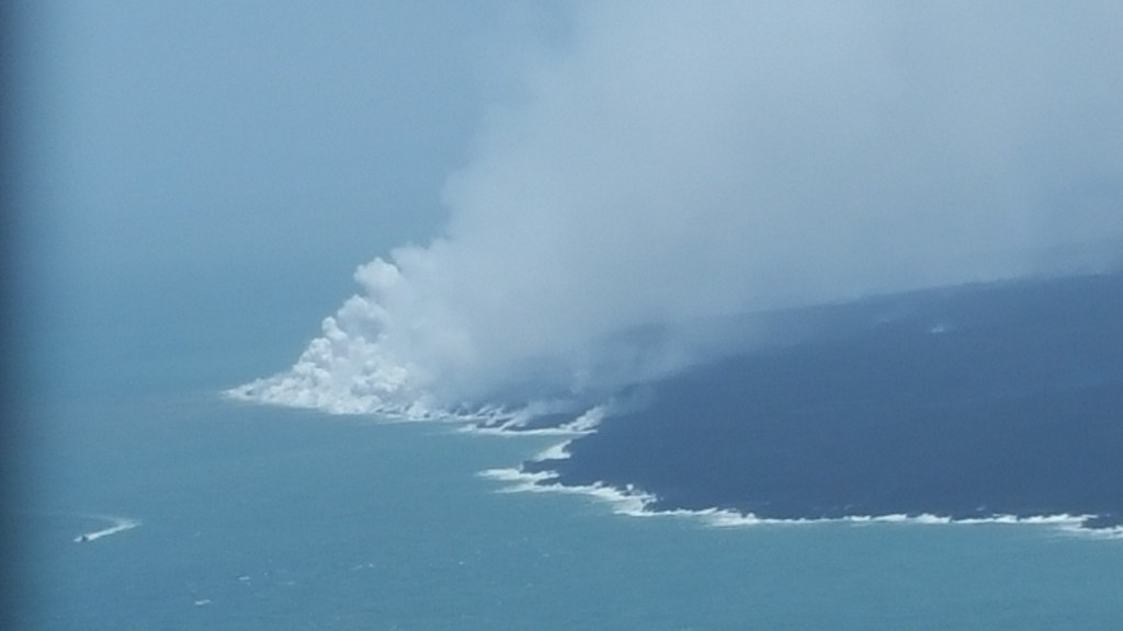There was a huge semi-circle in the water surrounding the area where the lava was entering the sea. Almost a perfect bouy line but without the bouys showing the changes to the water resulting from the lava. The ocean outside the circle was a beautiful dark blue, and inside was a sickly brown and sludgy green. White clouds of steam were billowing into the air for miles along the shore.
