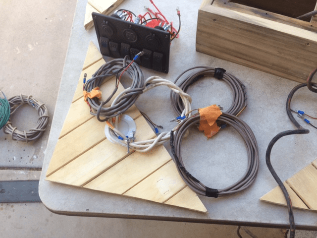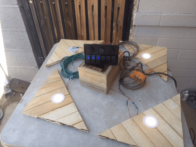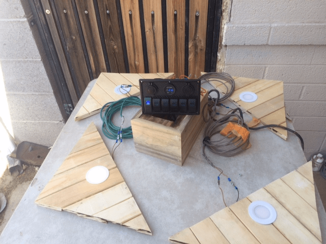 I built four triangle panels to install in the corners of the shed for the lights, and soldered connectors onto the wires for the lights.