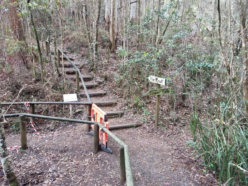 Off to the right is the beginning of a well marked, well used trail. An information kiosk tells about the falls, the flora, the fauna, the surroundings and the trails. It says that the trail to the bottom of the falls takes about 45 minutes – round trip. There is an alternative – instead of going to the bottom, you stay on the trail when you get to the turnoff for the bottom, and proceed to what they call The Knoll. This is a viewing area exactly opposite the falls on the opposite side of the canyon. A 15 minute walk. I proceed down the wooden steps and along the trail till I get to the turn off. It is closed. Blocked with orange caution tape, a plastic barricade, and signs indicating that it is under construction.