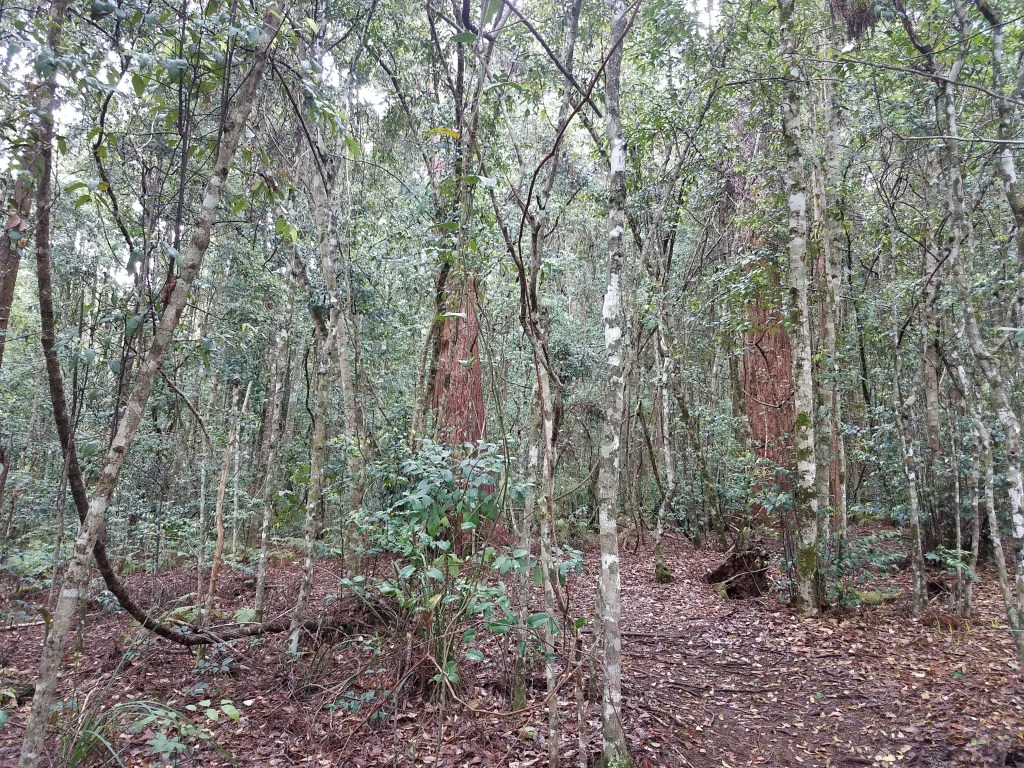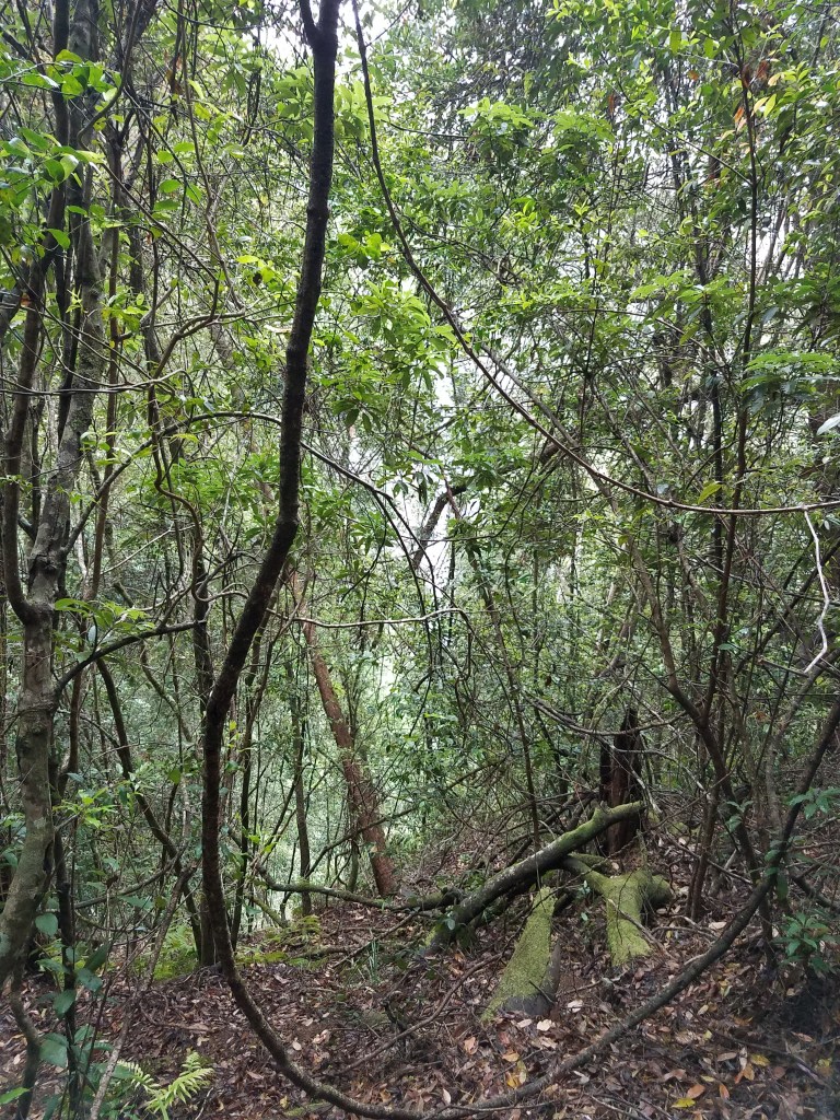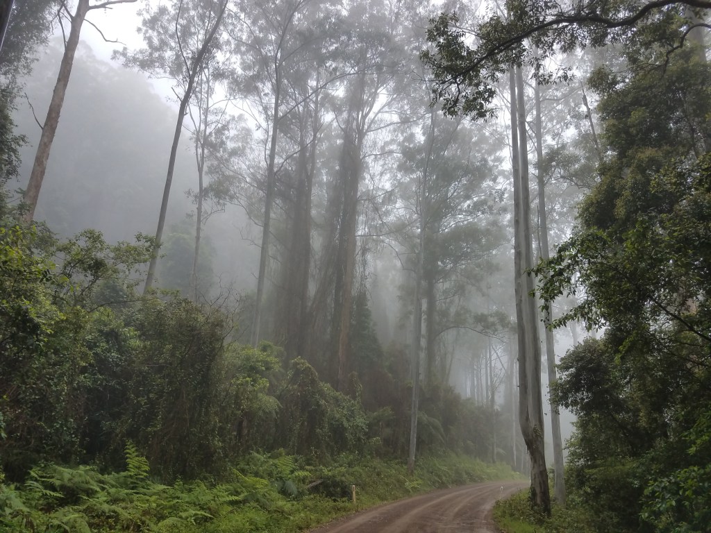 We passed some beautiful green farmland after a bit of bush, and ended in a lush rainforest. Somehow we found ourselves on what looked to me to be an unpaved, gravel forest logging road, going up the side of a mountain through a forest of tall trees like the Ponderosa Pines we have on the Mogollon Rim in Northern/Central Arizona, except these are all leafy trees – not the evergreen needle type. But they are tall and straight, and close together. It was an overcast day and it started to rain. The road became muddy and more than once we discussed turning around – the problem was there was no where to turn around. The mountainside on the left rose almost straight up and almost straight down on the right. The trees were all around us. We came around one turn and I thought for sure that Robin Hood and his merry men would jump out of the forest at any moment, or the Ent named Fangorn (Treebeard)! We came to another turn and we could see past the trees at the edge of the road, but the valley below was totally shrouded in clouds.