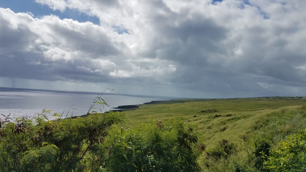Monday morning, November 4th, I wake up a little after 6:00 AM. Have a bowl of frosted flakes for breakfast and take a shower. I found that if I took off the showerhead, the water comes out of the hose in one steady stream, and feels a bit warmer. Under the far end of the front porch are the top half portions of some buckets that have been used as concrete forms. I “appropriate” these to use on my deck/platform at the bottom of the property. Also, I “borrow” a 4 foot level leaning against the wall in the third unfinished section of this building. I get into the Jeep and head off. Instead of turning left at the highway to go towards Na’alehu, I turn right and head into Hilo. I need to pick up some lumber for the deck at the bottom of the property. The trees on both side of the street are about thirty feet tall, and there is thick under brush growth. This is definitely a very wet area of rainforest jungle. A few miles down the road, I come to the Mountain View elementary school on the right side of the road. A modern well kept school complex – like most elementary schools today, there is an iron fence around the entire school. Further on, I drive past the town of Kurtistown and I notice that gasoline is priced at $3.79 per gallon at the 7/11 convenience store. I’ll check the price of gas in Ocean View later in the week. After Kurtistown, is the town/area called Keaau. At Keaau, there is a large intersection to the only highway down to Pahoa and the Southeast end of the island. There is always lots of traffic here, but this morning it is extremely heavy. Before getting to the bypass that connects Pahoa road to Highway 11 heading back into Hilo, traffic comes to a halt. We are 8 or 9 miles out of Hilo and traffic is moving at about 5 to 10 miles per hour. It is Monday morning, around 7:30 in the morning – must be the morning rush hour of people going in to Hilo for work from the outlying towns and areas. Slow and steady, it takes 45 minutes to get to Home Depot in Hilo. I pick up some 2 x 6’s and head out to Na’alehu. I drive back up past Keaau, Kurtistown, Mountain View and Volcano, before passing the entrance to the Visitor’s Center at Volcano National Park. I’m at about 4300 foot elevation and beginning to descend towards Pahala. Mauna Loa looms off to the right, the top shrouded in clouds and the slopes covered in green vegetation. Past the turn offs to Pahala and after the macadamia nut farms the road to Punalu’u Black Sand Beach goes off to the left. The ocean and shore views stretch out before me as I descend into a small valley with a flat bottom. At the bottom of the hill is the gated area that leads to a ¼ mile walk through the trees and grass to a crescent bay of black pebbles. Along this pathway, there are a few signs telling about historical events, and information about the plants along the way. At the other end of this valley is the other entrance to Punalu’u Black Sand Beach and Sea Mountain Condominiums. About half way across the valley there is a corral area off to the right under the Monkey pod trees. Directly opposite the corrals is a road with a yellow gate that is open and leads off through the tall grass towards the ocean. I have driven past it before seeing that the gate is open and decide that there is no time like the present to go exploring. I turn around and go back to the gate. Less than 100 feet past the gate, there is a rocky hill that would be difficult in a 2-wheel drive vehicle and impossible in a rental car.