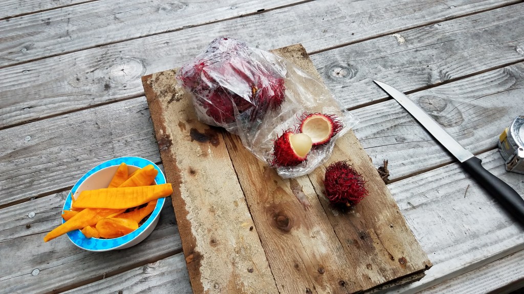I stop at Punalu’u Bake shop and buy a loaf of guava flavored bread rolls. Then I go across to the convenience store/gas station and get a bag of ice, and drive to the park at Waiohinu to fill up the bottles with water. It is noon before I arrive at the property on Holowai. I back into the parking spot I have created and place the buckets of rocks where the tires would go as I cross where I believe the property line to be. Using the jeep, I crush the branches and pebbles more into the driveway. It’s going to take a lot of trips for small pebbles.