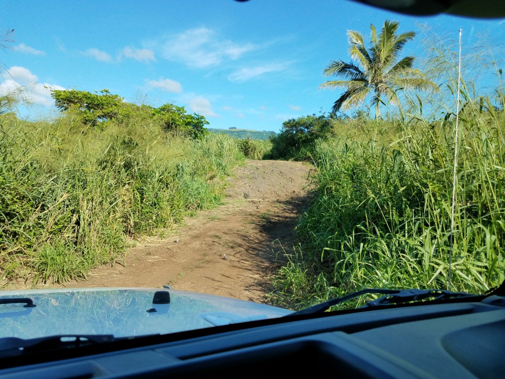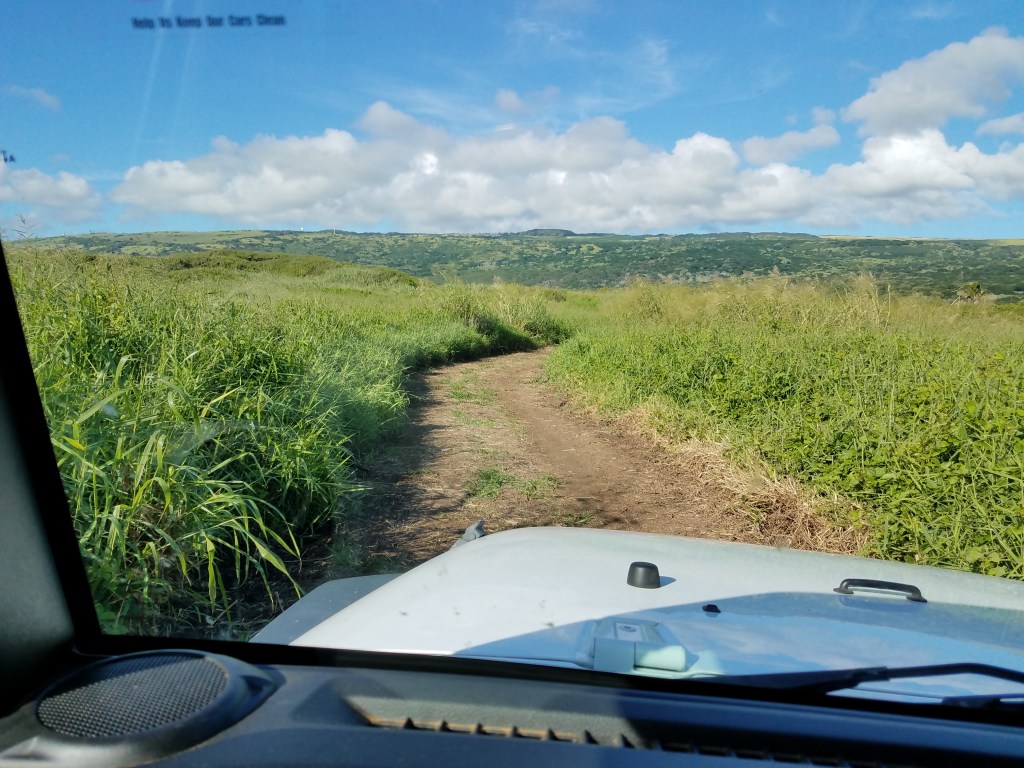 The road meanders through the tall grass, passing under monkey pod trees, and more rocky 4-wheel drive required areas.