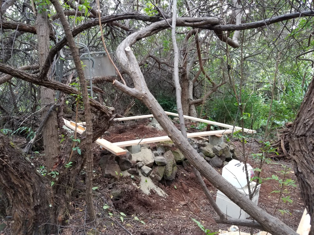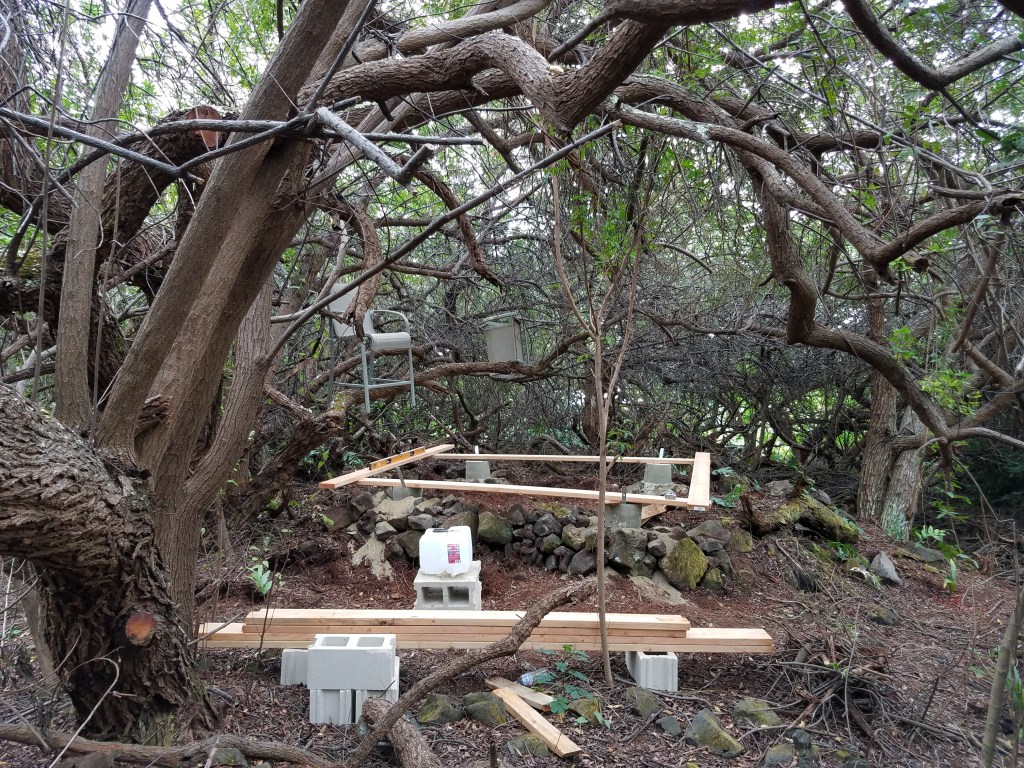 I unload the 2 x 6’s from the jeep and take them down to the bottom of the hill where I am planning the next deck. The humidity is making itself known and I stop to rest many times. I move the concrete blocks to the bottom of the hill, and proceed to plan on how to construct this deck. I try leveling out the small hilltop and remove the dead limbs and branches. I stack a few rocks at the north side making a small rock wall.
