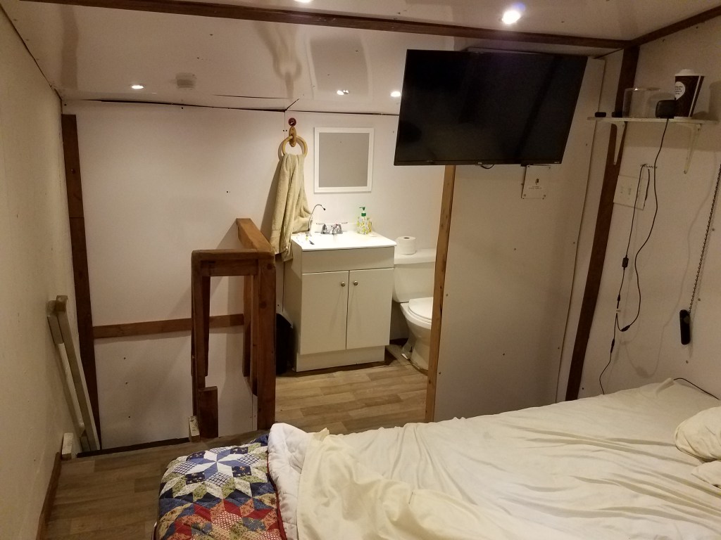 Between this wall and the windows is a queen sized bed. Hanging on the wall is a 48” flat screen TV. The floor upstairs and down is covered in what looks like sheet vinyl. The seam in front of the vanity is held down with staples.