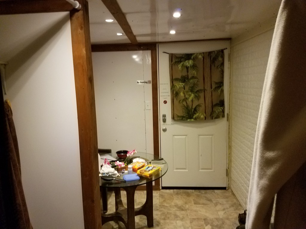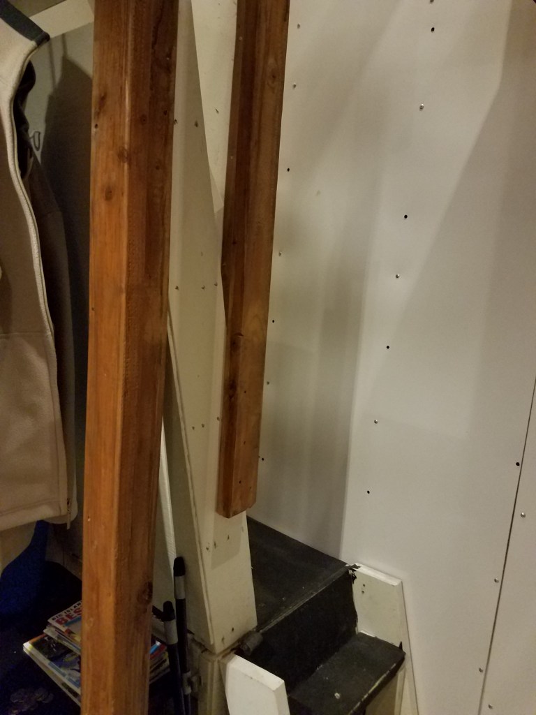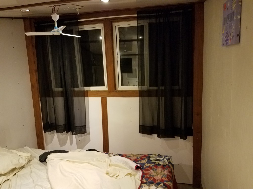 I put my suitcase on the table, hang up my jacket and proceed up the ladder. At the top of the ladder, the ceiling is about 4’6” high and slopes away to the south where it is probably 8 feet high. The walls and the ceiling are covered with a plastic/melamine board with wooden strips over the joints – well, most of the joints. This same 1 x 3 is used in some areas as the baseboard. At the far south wall, there are two aluminum sliding windows at 4’6” off the floor.