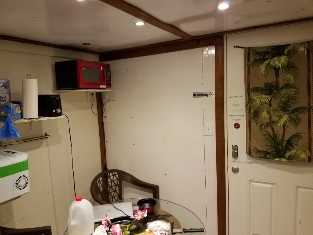 Immediately to the right as I enter from the porch (or Lanai) is a shelf in the corner at about 5 foot high with a small microwave.