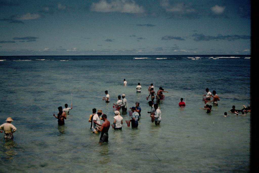 When I was young, we did a similar hukilau, but instead of one big net, each person had a small net. The group of people in the water would cause the fish to swim around and hopefully, they could be caught by the individual nets.
