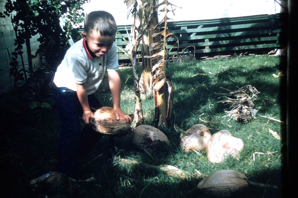 This is me trying to husk a coconut. We used to stab a pick into the ground and use the sticking up point to tear the husk off coconuts.