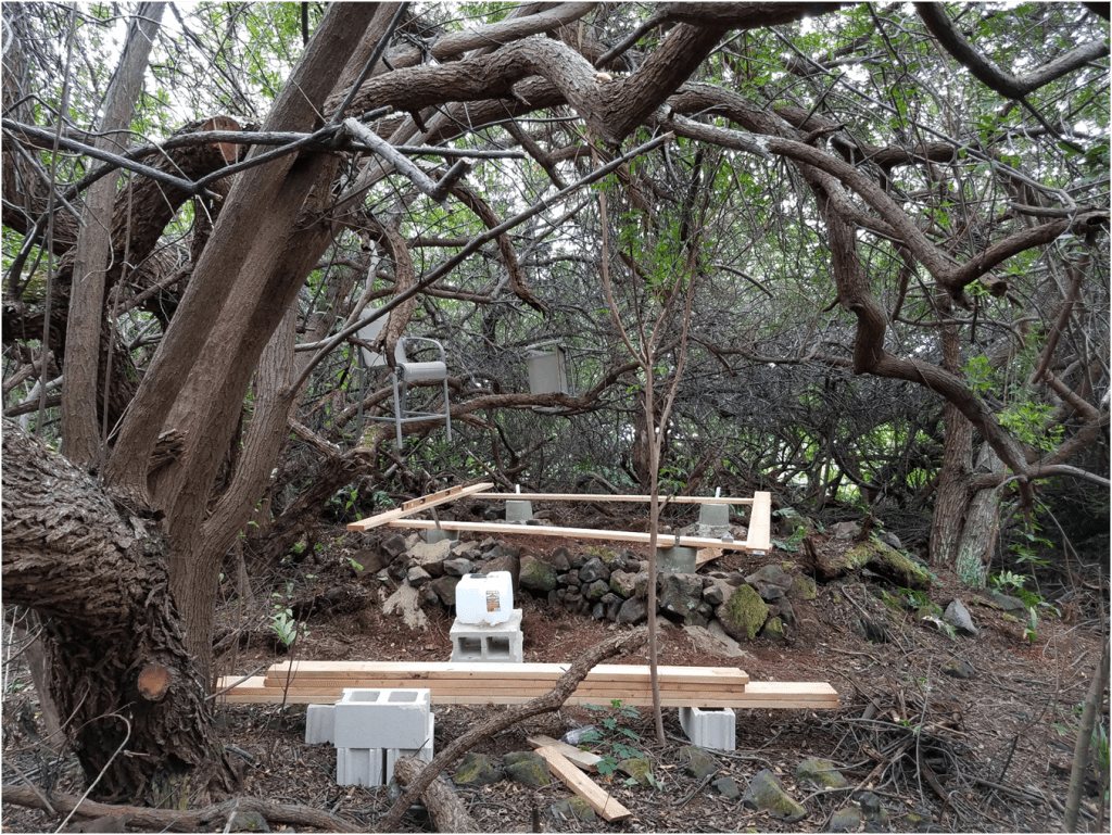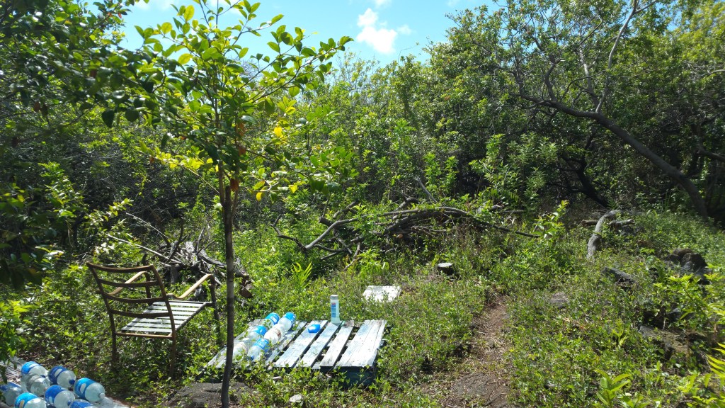Two trips ago, I had brought a little cardboard box about 2 1/2 inches square. It was a small cube. Inside was what they called a “tomato bomb”. It was a roll of fibrous material with tomato seeds and fertilizer. Theoretically, you just add water and it “explodes” with tomato plants. Accidentally, I had stepped on the box. So, I took what was left of the roll and put it into the end of an upright hollow log about 2 feet long along with some leaves and dirt. Then I began watering it. I figured that the rotting log would provide some sort of nutrients for the tomato plant and I watered it for the next two weeks. Sure enough, three little tomato plants came up inside the end of the rotted log. I had also put a spoiled tomato into a 1 gallon plastic pot along with some leaves and dirt. I had been watering this as well as the tomato bomb. Two plants came up in the pot. All of these plants were about 10″ tall when I left to go back to the mainland. When I returned on my last trip, there was one tomato plant in the log and one in the pot. They were still about 10″ tall. They were barely alive and I started to water them again. They responded and grew to about 16″ tall in the following three weeks when I had to go back to the mainland.