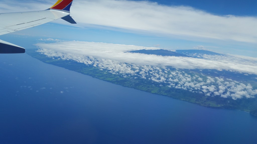 About an hour away from Hawaii all the clouds cleared up. There are a few clouds above us and a few below, but it is mostly clear. As we pass between the Big Island and Maui, the mountains on both islands have a ring of clouds around them like giant white lei’s.