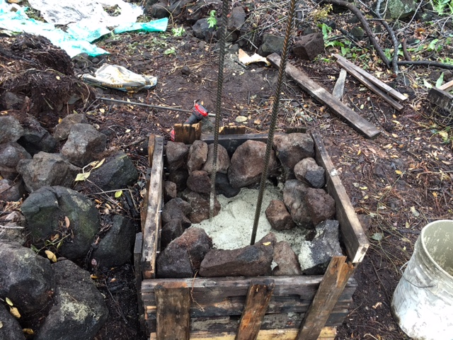 From the new 4′ wide entry gate, I have carved out a pathway through the jungle and tried to level the ground as much as possible. The pathway angles from the gate back towards the site for the house. There were some small trees to be cut down, lots of bushes to be removed, and two large rocky humps to be leveled and used to fill in the low spots. I have also lined this pathway with short rock walls. Now I need 4 or 5 wheelbarrows full of cinders.