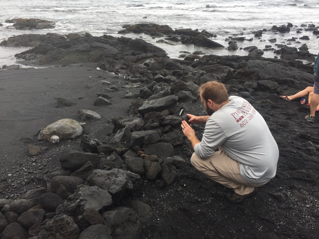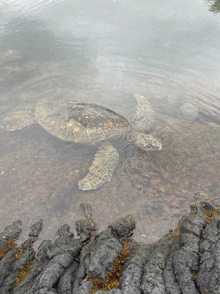 Then we went to Punalu’u Bakery and to Whittington Beach where we did not get out of the car because of the rain. After sitting in the parking lot for about ten minutes, we drove over to Punalu’u Black Sand Beach. As you leave the highwat to get to Punalu’u Black Sand Beach, you must drive past the Sea Mountain Golf Course and condominium complex. At the edge of the development, there is a road that goes between the golf course and the ocean. Actually, this road is about 2 to 300 yards off the shore line with rugged undeveloped land between the road and the shore. We found a road that headed off into this undeveloped area commonly known as Ninole Cove, and drove out towards the ocean. There is no sandy beach here, but on a better day – one without the overcast and the rain – it might be a place to come to swim. After exploring here a bit, we went to Punalu’u Beach to see the turtles. Away from the area most frequented by the tourists, there is a rather large tide pool. As we were exploring here, we saw a large green sea turtle inside this tide pool. The tide pool is about 100 feet across, so there was plenty of room for the turtle.