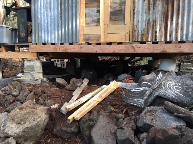 I worked under the shed today, removing the large rocks and leveling out the dirt. Trying to create more under cover storage area. Now that I have created concrete pillars at three corners of the shed under the roof posts, the original bucket sized concrete supports and the double 2 x 6 beams under the floor rafters are redundant.