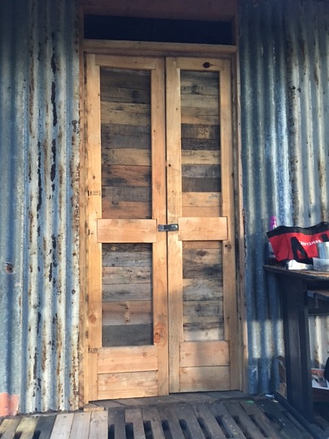 The other three sets are held in place with a 1 x board screwed across the opening and screwed to the doors. Today, I hung the set in the south wall. I have both sets of doors (in the north and the south walls) open tonight to provide ventilation and I will sleep in the tent.