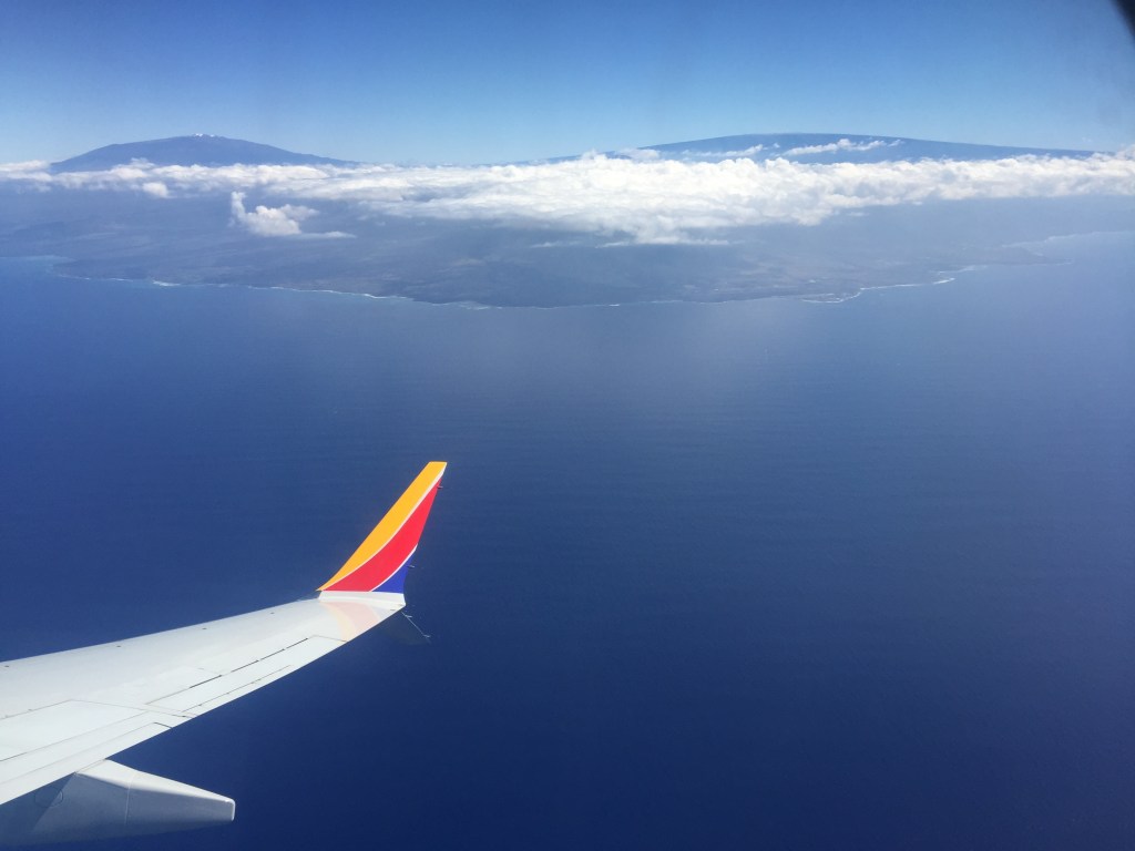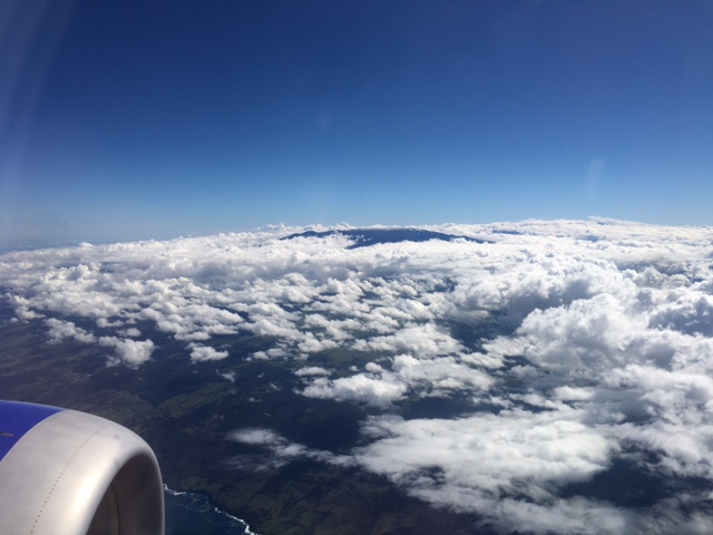 As we fly away from the island, we have a great view of the volcanoes. I can clearly see the snow at the summit of Mauna Kea – perhaps even some snow on Mauna Loa.