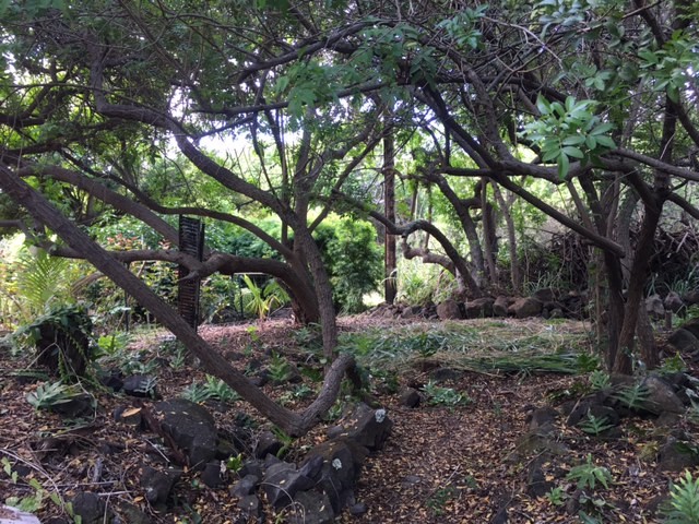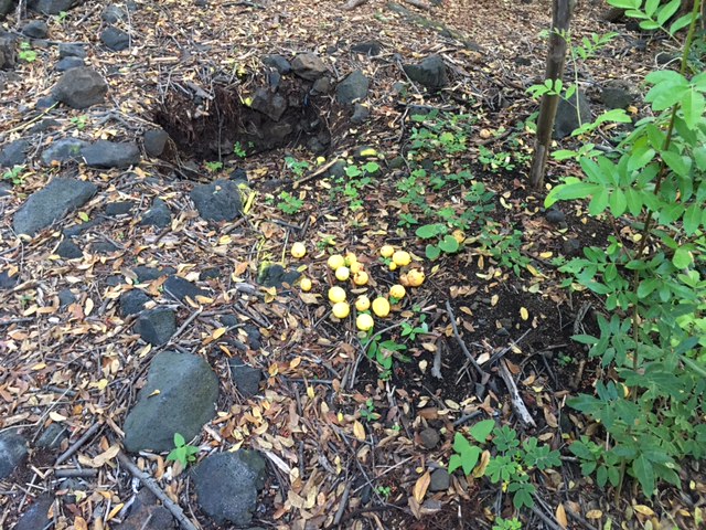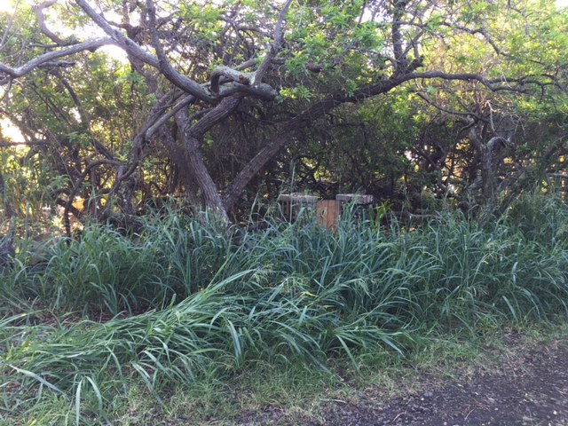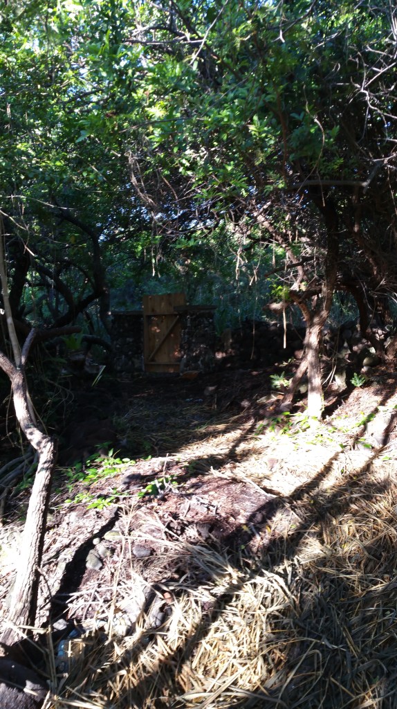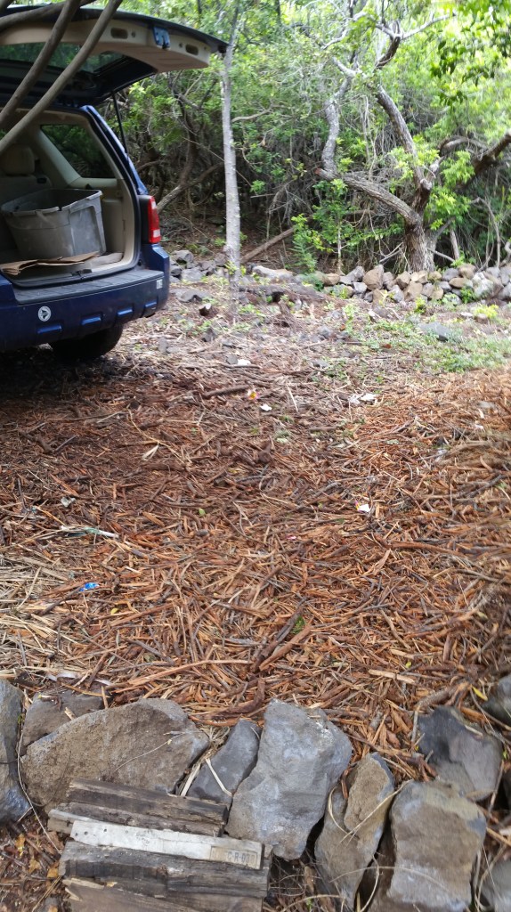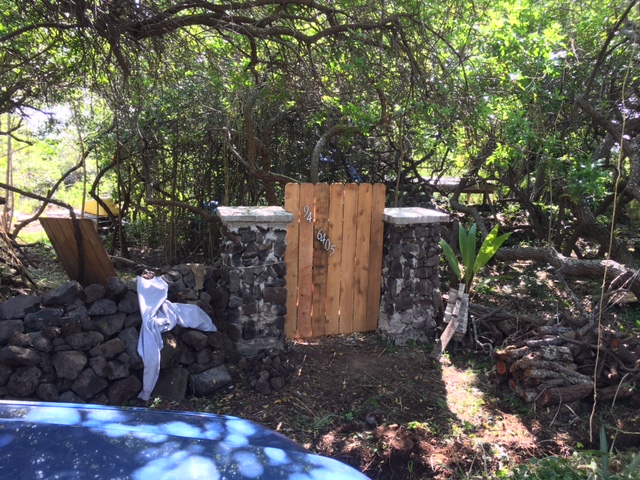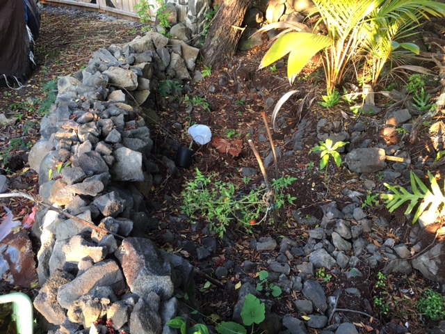 When I was creating the driveway, I dug a trench under the neighbor’s 1″ black water line that runs past the property. This black poly pipe extends for about 1/4 mile to Wakea Road where their water meter is located Everyone in this subdivision with county water has their water meter on Wakea or on Kama’oa Road. Then they lay a black poly pipe on the ground all the way to their property. I dug this trench and buried the pipe at the entrance to my driveway to protect it from damage as I drove into the property. I dug a trench abour 8 to 10″ deep – mainly by removing the rocks – and put a couple of inches of sand in the bottom of the trench before placing the pipe in the trench with more sand to cover the pipe. Then I filled the trench with what dirt I could find.