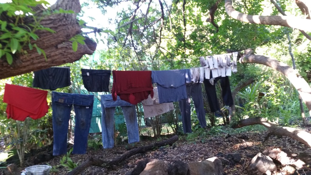 It is now 3 PM. time for a shower. I took 5 two liter soda bottles full of water that had been sitting out in the sun all day, down to my shower – a five gallon bucket with a hose attached to the bottom and a shut-off valve in the hose.
