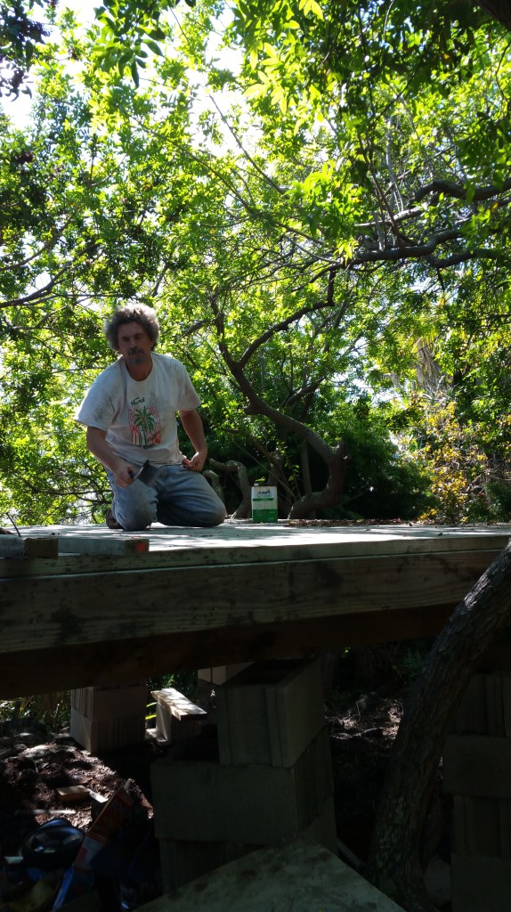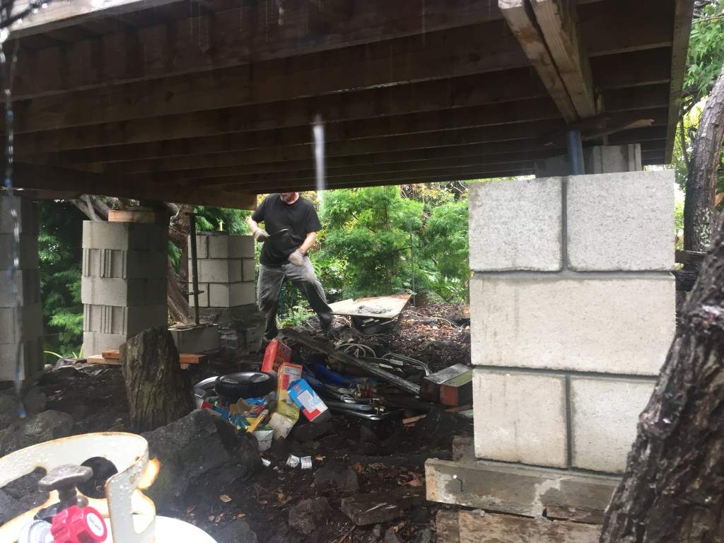 Thursday and Friday were spent working under the original platform. I am enlarging the footings so I can build 16″ square block solumns and raise the deck to 8′ high – making it a flat topped gazebo so I can move my kitchen underneath.