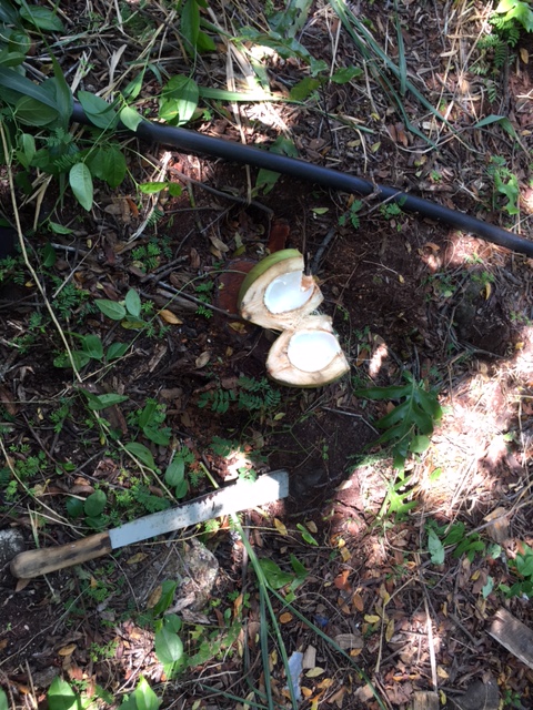 During my last trip in November, I had “acquired” four coconuts. We opened two of them and shared them. Today, I picked up one of the two remaining and sliced it open with a machete. I enjoyed the coconut milk and the coconut meat.