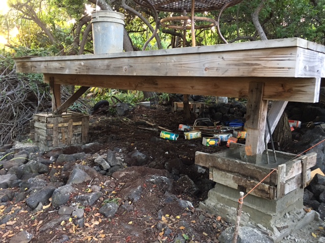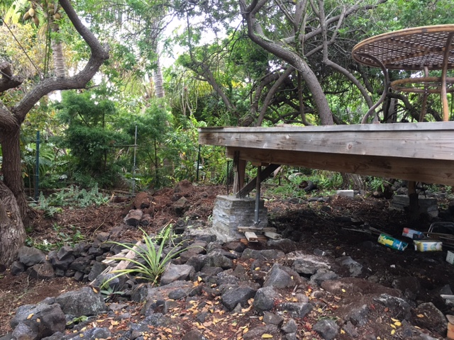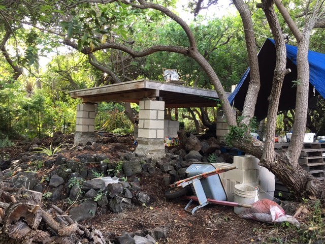 As I was raising the north end, it became very unstable and the whole deck started to shift. Apparently, as I was raising the north beam, it was also raising the southeast corner leaving only the southwest corner sitting on the stable pile of block I had put under each corner as a safety measure. I was able to raise the north beam so the deck was level. I placed block piles under the north beam in two places to support it while I laid the block. I noticed that it was 3:30PM I wanted to mail a letter. The Post Office closes at 4PM and I need to buy a stamp. So, I got in the car and hustled down to the post office in Naalehu. It was raining in Waiohinu as I went through.
