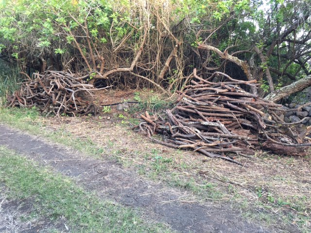 Yesterday, I had created a large pile of branches in the upper portion of the driveway, so today I ran them through the chipper. I tried to move the car out of the driveway, but the battery is dead! Started the car with the solar battery, and went to Ocean View for a battery. $140.00! I think I will put up the hammock and take a nap!