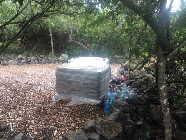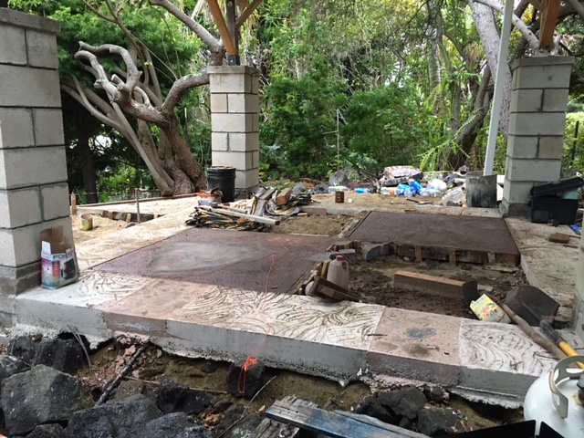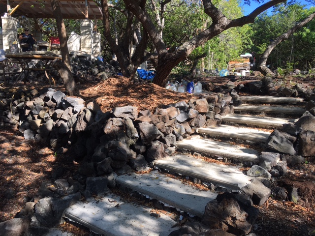 The septic system is completed. The gazebo floor is poured. the lanai extension floor is also poured. Concrete steps have been installed through the garden and down the hill for easier access. The random piles of cut branches have been gathered up and cut into small pieces. These small pieces have been stacked behind some rock walls to continue to deteriorate and create compost for planting in these areas.