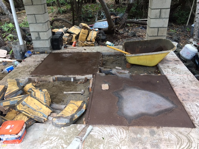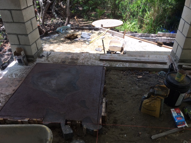 One project is to complete the floor of the gazebo. I have brought some color for the concrete I will pour around the islands I had created on my last trip. I set up a form to divide the gazebo floor into quarters so it would be easier to pour. I did not think I could pour it all at one time.