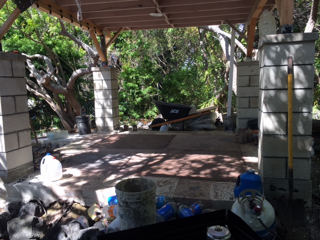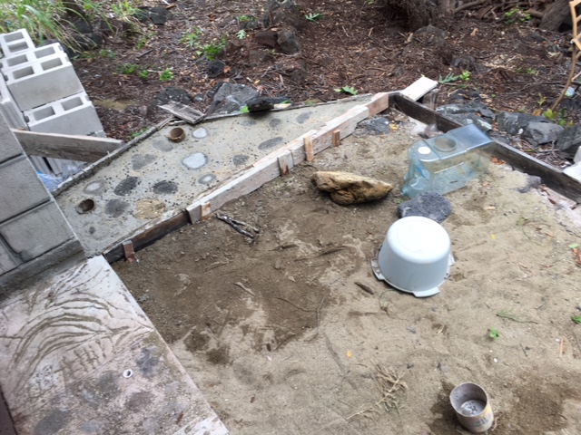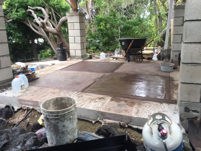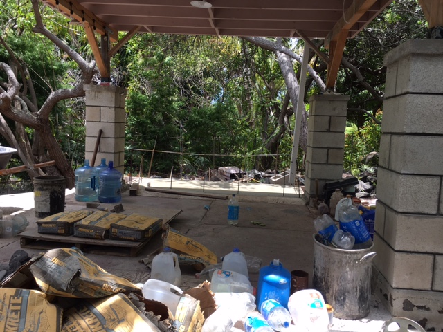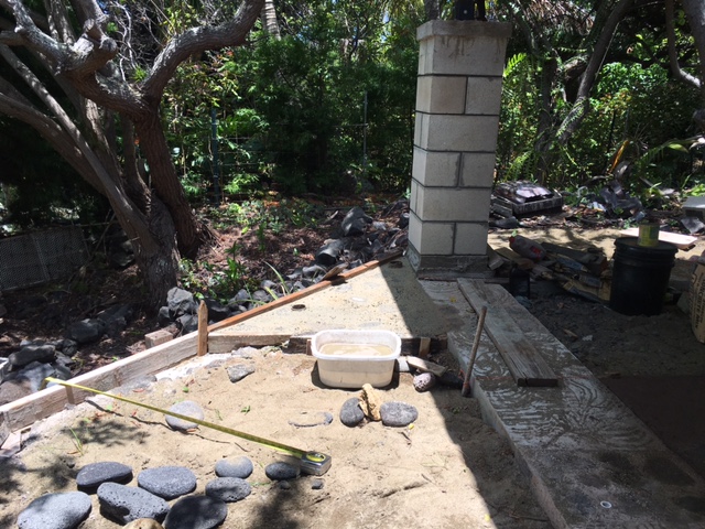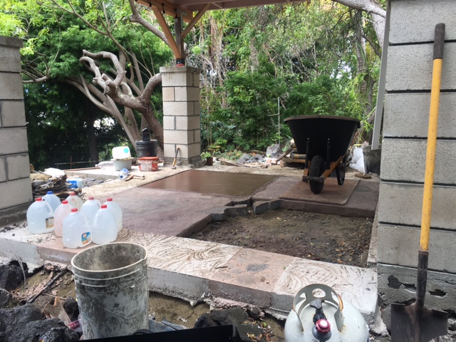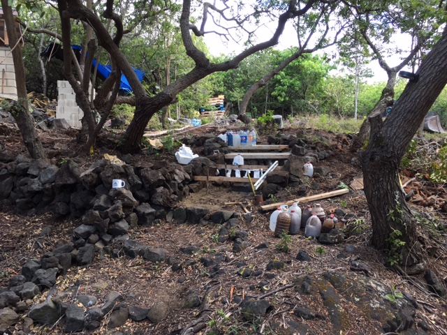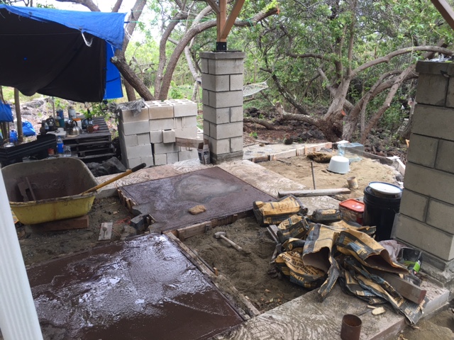 While in Hawaii, I accomplished a lot. I poured the concrete floor under the gazebo. I poured the concrete on the lanai extension of the gazebo. I hired the contractor for the septic system and he completed it. I will create an entire post just about that! I built a water storage tank to collect rain water from the gazebo roof. I moved a lot of rocks, built some rock walls, moved a lot of old cut down tree limbs, chipped a lot of branches, and built a set of concrete steps down to the lower section.