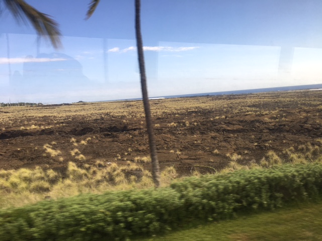 As I ride the bus out of the airport, I look at the brown desolate landscape outside the airport grounds towards Kona to the south. A mixture of dry wild grasses growing helter skelter within the lava fields. Later in the week, i learn that there is a massive wildfire burning on the Big Island north of Kona. With all the dry vegetation, I can see why!