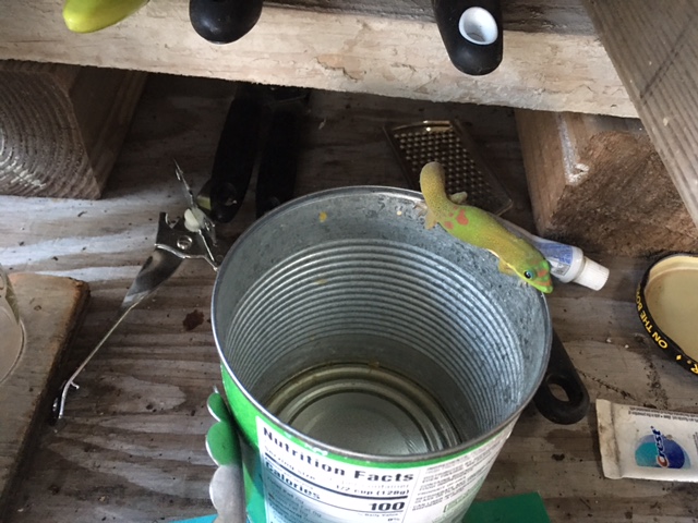 After moving the kitchen up to the gazebo, I noticed the geckos seemed to have followed, and there were more of them. The new ones, I called Manny, Moe, and Jack. The one in the picture climbing into the peach can is not one of the original three Stooges, he has a darker tail. One day, I saw one that looked like his tail had been cut off as he just had a short stump of a tail.
