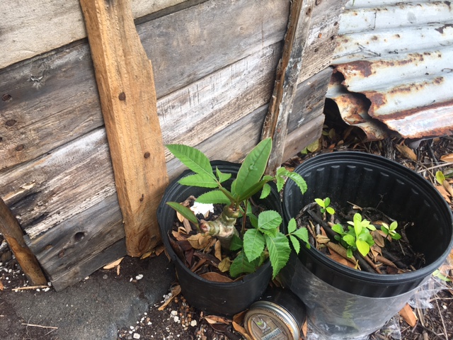 The smaller plumeria is doing very well also. There also is something growing in the other pot . . . perhaps some type of citrus? tangerines?