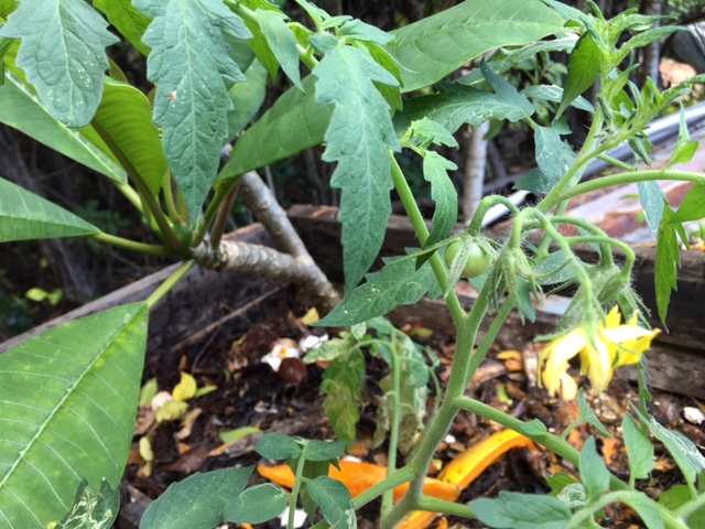 When I get to the lot, I find that there is a tomato plant growing in the planter with the plumeria. and there are four little tiny tomatoes on it!