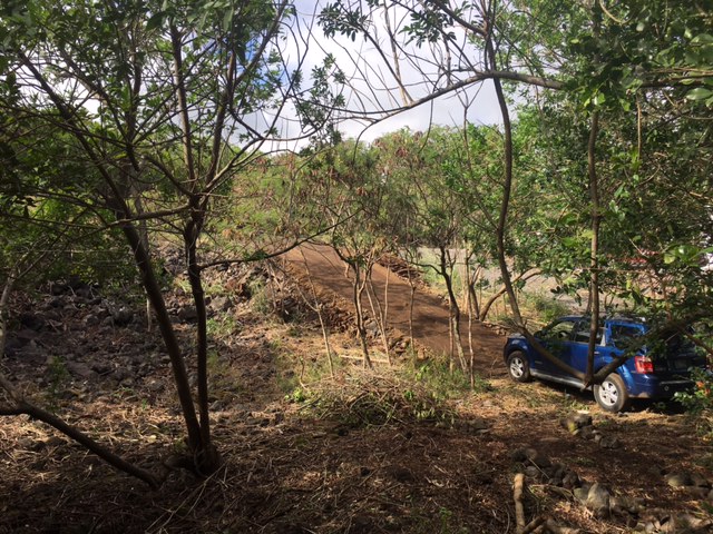 A visit to the Ahi Road lot showed the driveway still unfinished at about halfway down the hill and a pile of branches where I left them. The neighbors have moved their trailer down onto their lot along the property line and their truck and camper is at the lower edge of their lot.
