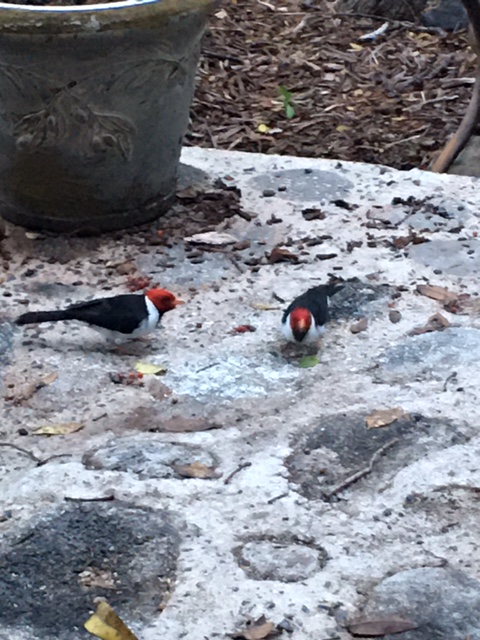 During my last trip in September/October, I had enticed some small birds to come down to the lanai next to the gazebo for crumbs of bread or crackers. They were timid at first, but got bolder each day. I called them Ernie and Bert! For the first few weeks of this trip I did not see them at all, but eventually they returned and started picking up the crumbs.