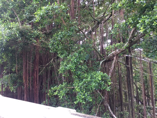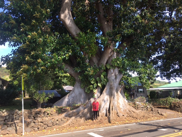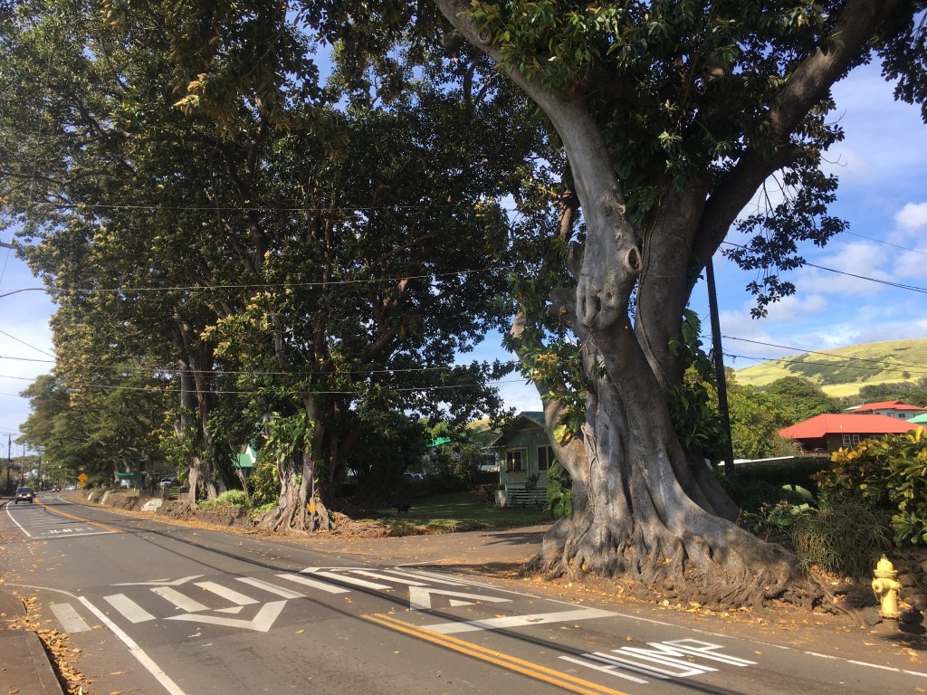 On Sunday the 4th, we rode the bus to Hilo and rented a car to drive up to the Saddle Road and hope to catch a glimpse of the lava flows. While waiting for the bus in Na’alehu, we admired the huge trees that line the main street.