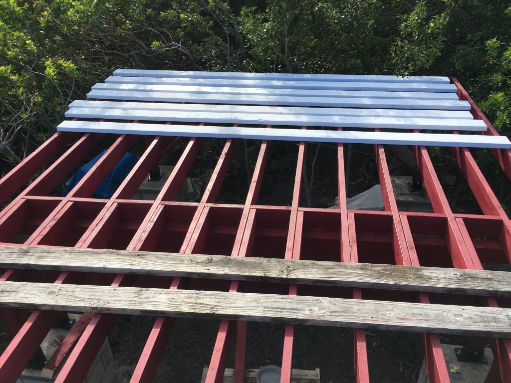 Today I finished installing all the main rafters on the gazebo at the back of the Ahi lot. I also installed one row of blocking – 3 more rows to go.