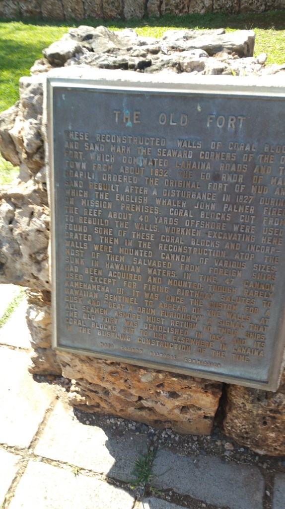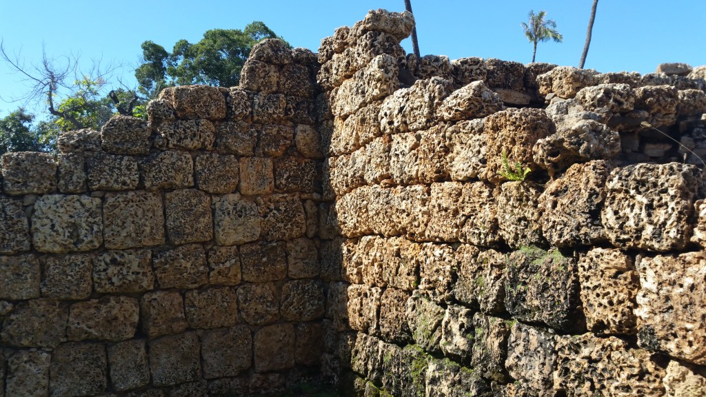the rebuilt corner of the ruins of King Kamehameha’s fort built out of coral blocks quarried out of the coral reef
