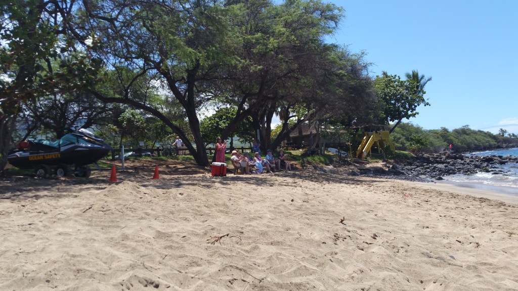 As we walked down the sidewalk towards the beach that is a 20 to 30 foot wide sandy beach, we passed a group of 6 or 8 people sitting in a line of beach chairs back under the trees in the shade.