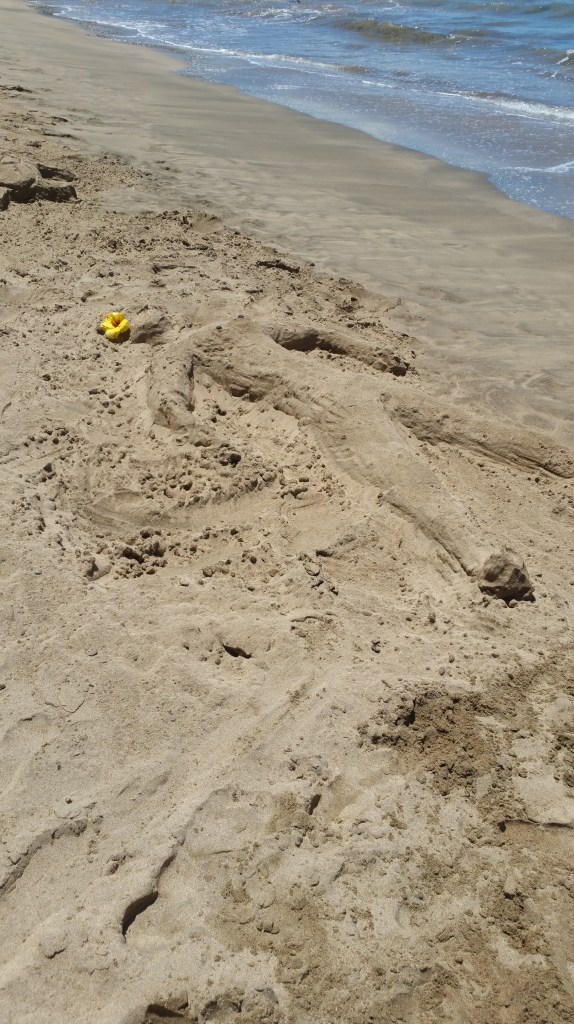 Others with a boogie board were able to stretch this out to 40 or 50. As we were hanging out in the water, we saw a large dark shape approaching under the water. It was a very large turtle; possibly 5 foot across it’s shell. He stuck his head up for a second and then went back down and continued on past us and up the beach. A little while later, we saw two more smaller ones – each one about 3 foot across.