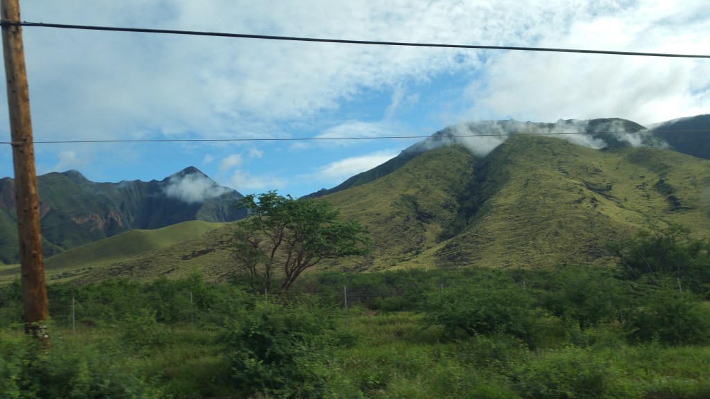 We drove past the port town called Ma’alaea on the coast to the left of the higway and the hills/mountains of west Maui rise up on the right, green and rugged!