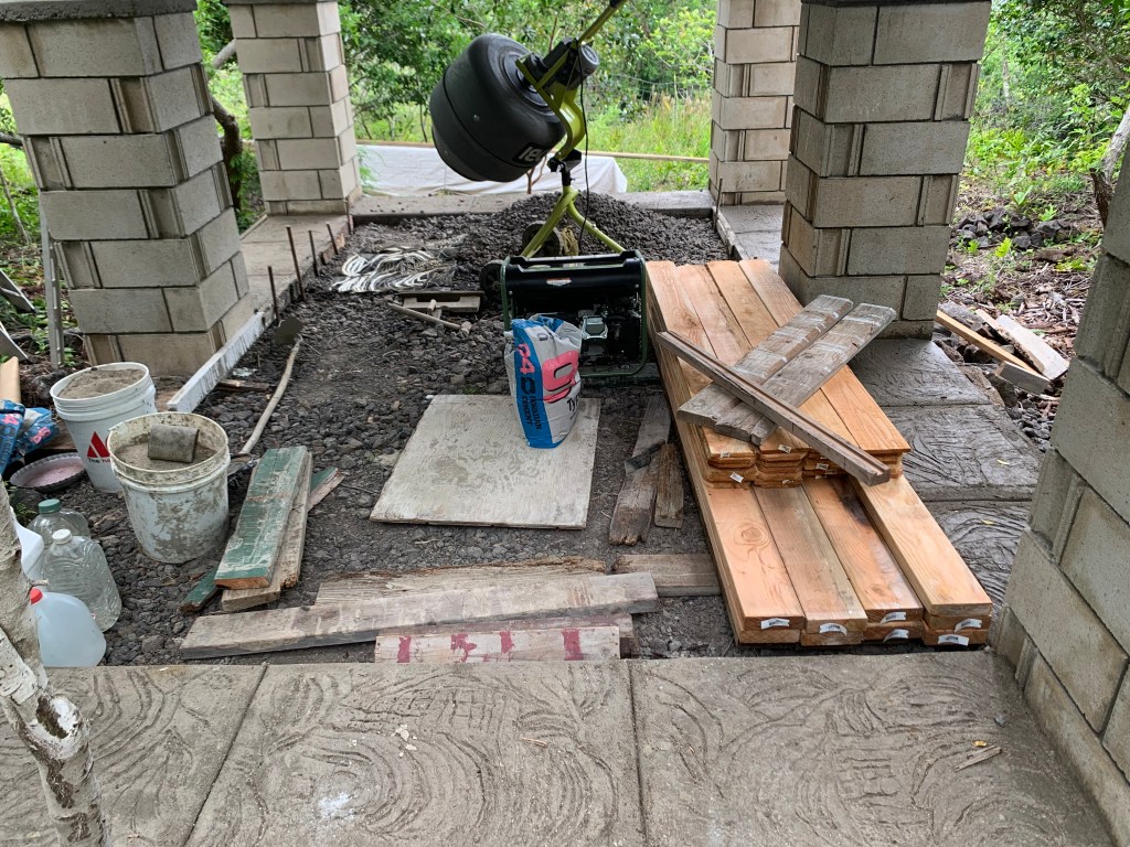 Today, I poured the 5th section of concrete between the columns at the Ahi gazebo. The 6th section still has some large rocks protruding above the surface of the new concrete, so I will need to find some way to remove them – a hammer and chisel? a large prybar? a jackhammer?