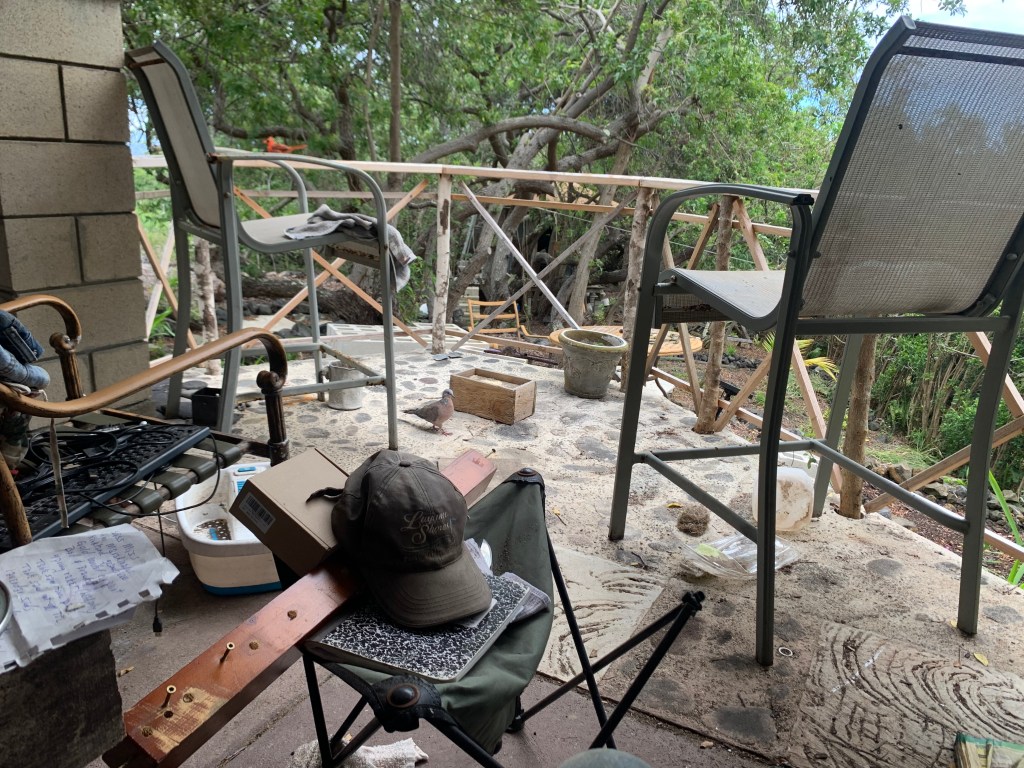 On Saturday, I crumbled up a cracker into the wooden bird feeder I made during my last trip. Around noon, a red cardinal flew into the tree branches above the lania outside the gazebo. He was not as bright red as the others I had seen on previous trips, in fact, he was all dishreveled. He looked like he had been in a clothes dryer. A slight breeze caused his feathers to stand up, adding to his dishreveled look. He came down to the handrail but not any further.