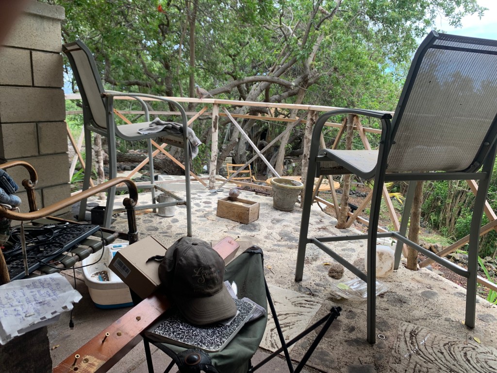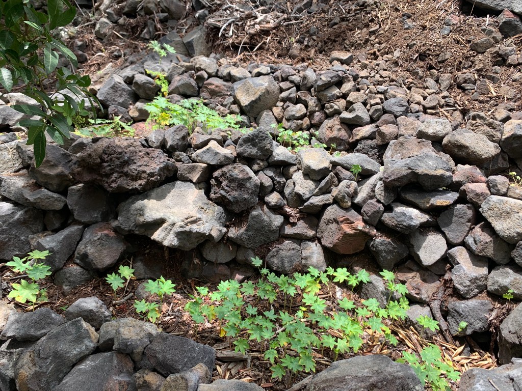 and there are about a hundred little papaya trees growing in the rock tiered planters I created on my last trip on the front hill by the road.