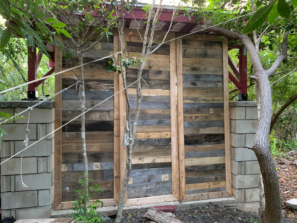 Using pallets as a floor and walls, I built an outhouse with a composting toilet.