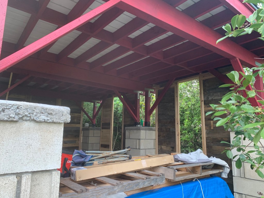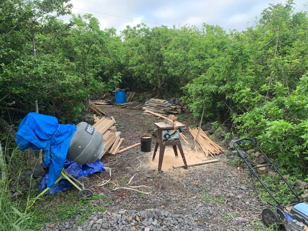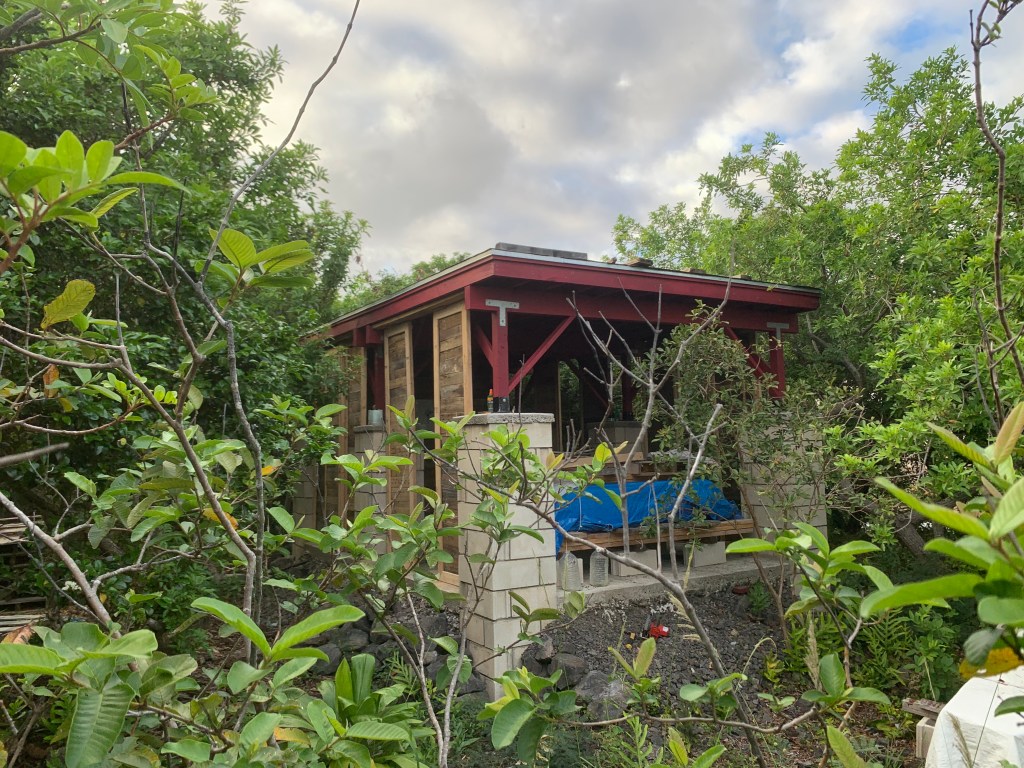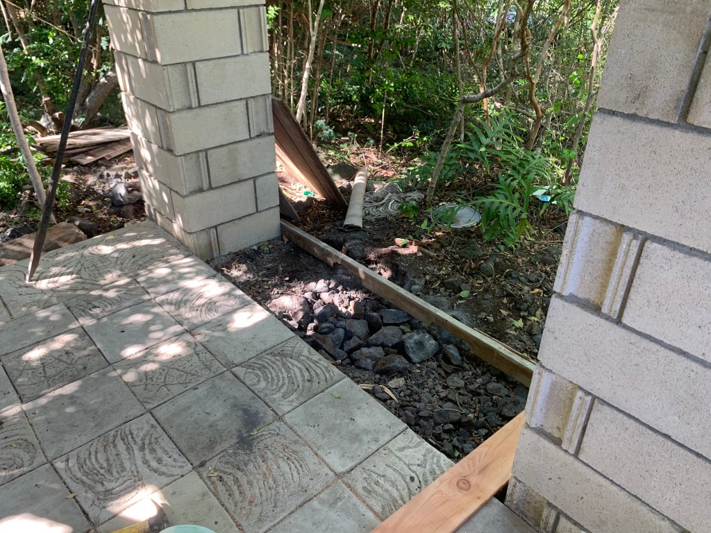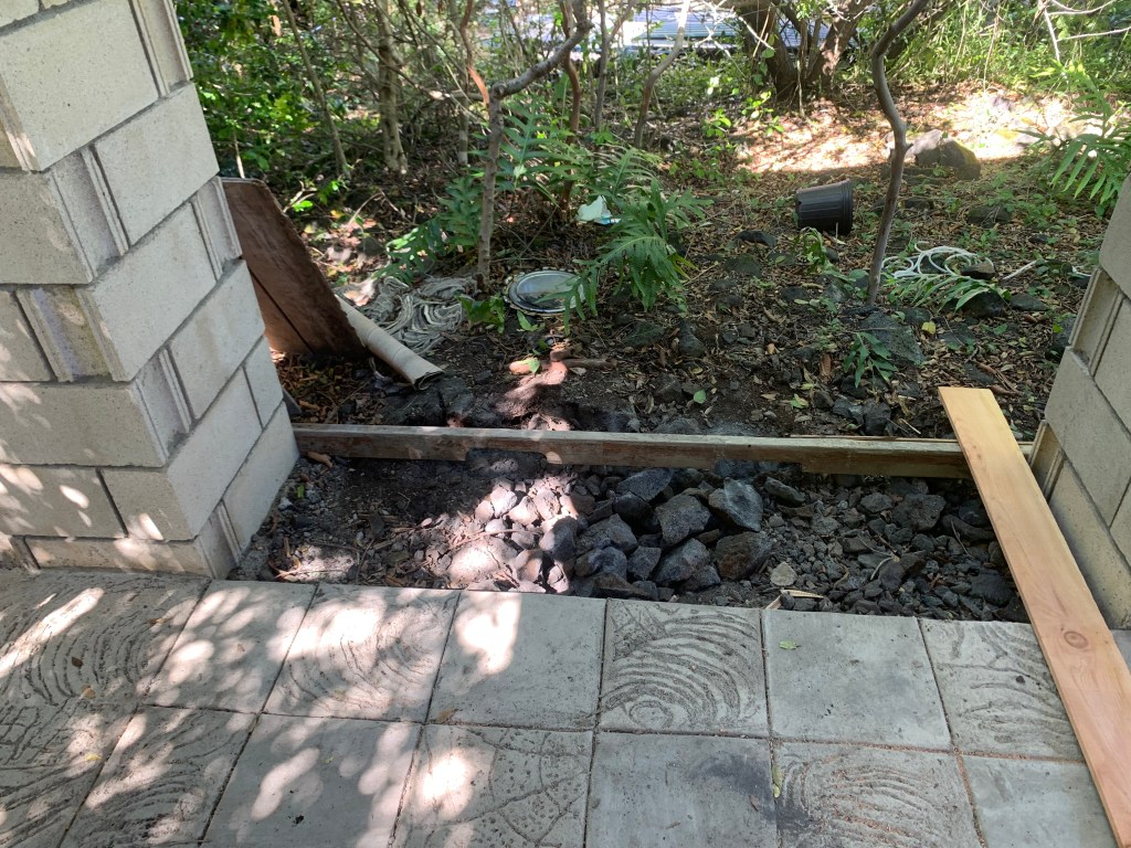 The gazebo at Ahi had a roof, and a floor, and no walls! There was also a section of the floor with a large rock sticking up. when I was here before, i tried to remove this by prying on it with a big prybar, and pounding on it with a sledge hammer to try to at least break it up to below the floor.