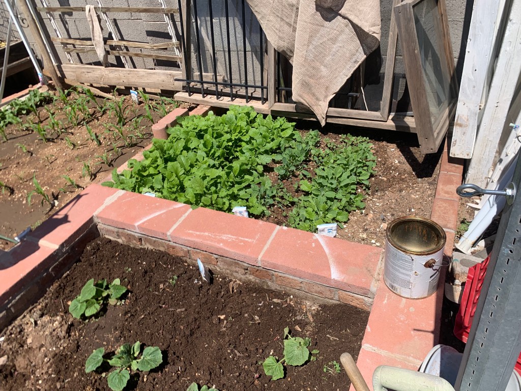 In the planter behind this one, there are two rows of turnips, and a row of cauliflower and a row of cabbage.