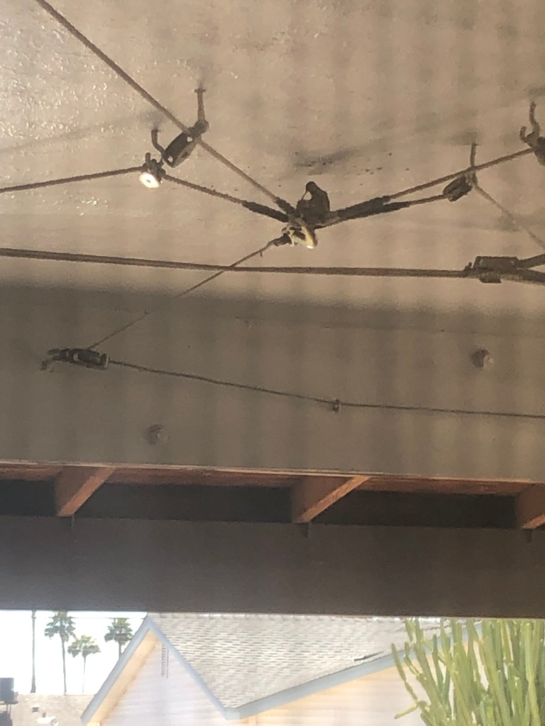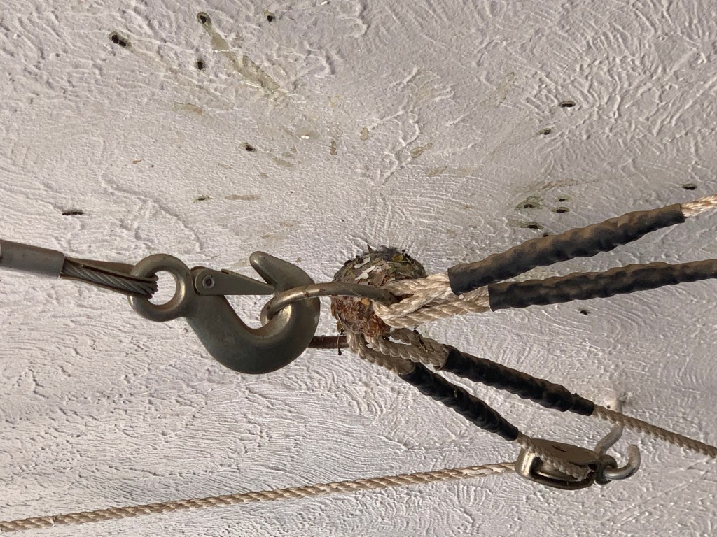 Today, I found out. There were all kinds of bird droppings on top of Alanah’s Mercedes. Not big droppings like from a duck or a goose, but little droppings. They were definitely bird droppings, and there were lots of them. Directly above them is a series of ropes and hooks that I installed to lift the top off the convertible. On the ceiling above the ropes there are more of these droppings. Nestled within these ropes is a very small nest made of grass and leaves and paper shreds, very tightly woven together. It is smaller than a golf ball.