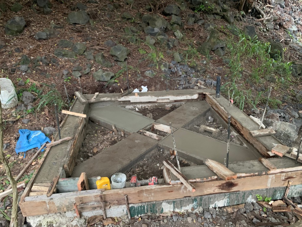 I set up forms for the opposing cross in the “X” as well as a 6″ wide stem wall around the perimiter of the bathroom.